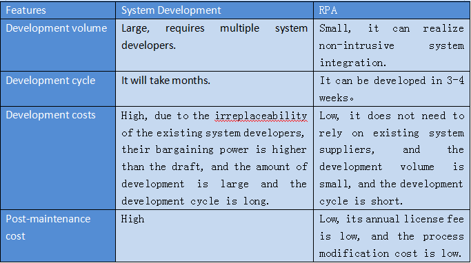 After demonstration and comparison, the Daxin RPA system can replicate manual operations in a virtual environment, collect and interpret existing applications through robotic software, process data and trigger responses, and interact with other digital systems. It has a short development cycle and low development risk, low maintenance costs, fast and accurate conversion of business data into financial data, etc.